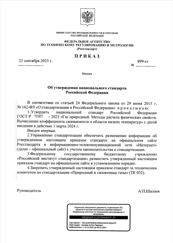 ООО ЦМ «СТП» совместно с ООО «Газпром межрегионгаз» разработало национальный стандарт Российской Федерации ГОСТ Р 70927-2023 «Газ природный. Методы расчета физических свойств. Вычисление коэффициента сжимаемости в области низких температур» (приказ Росстандарта от 21.09.2023 г. № 899-ст) с датой введения в действие 1 марта 2024 г.